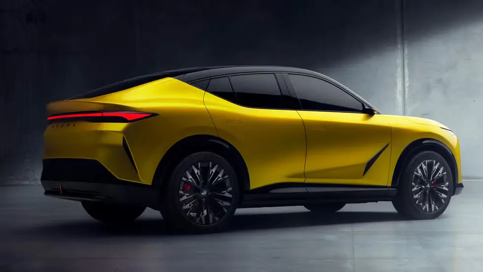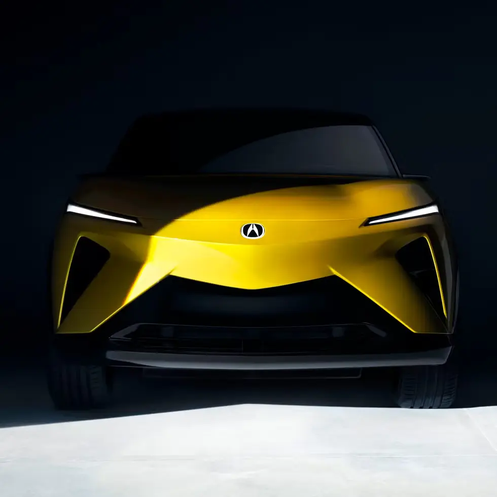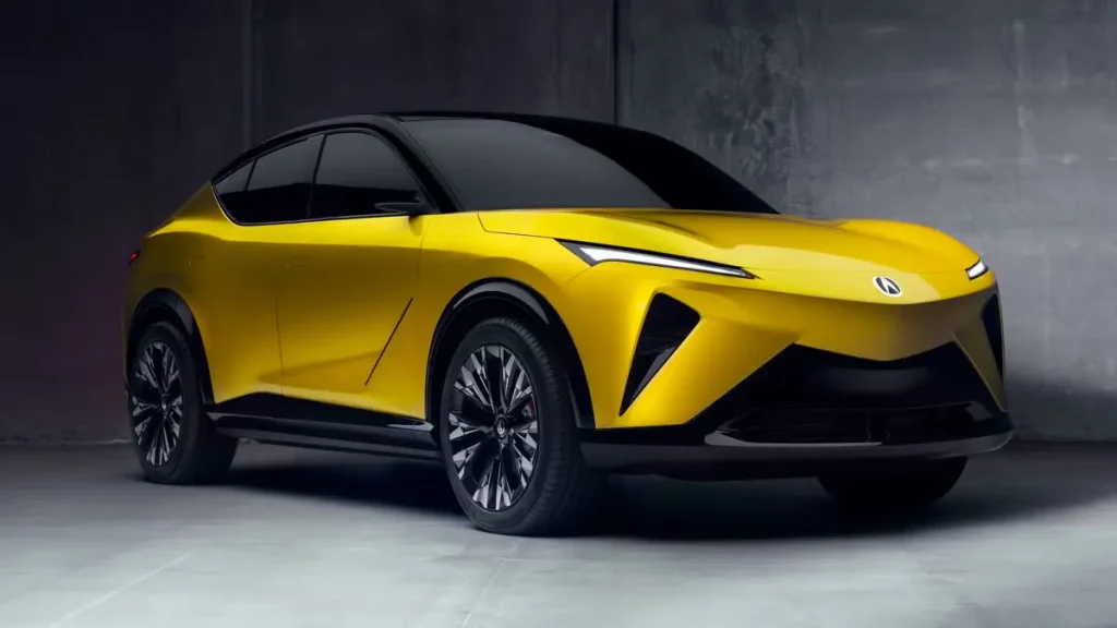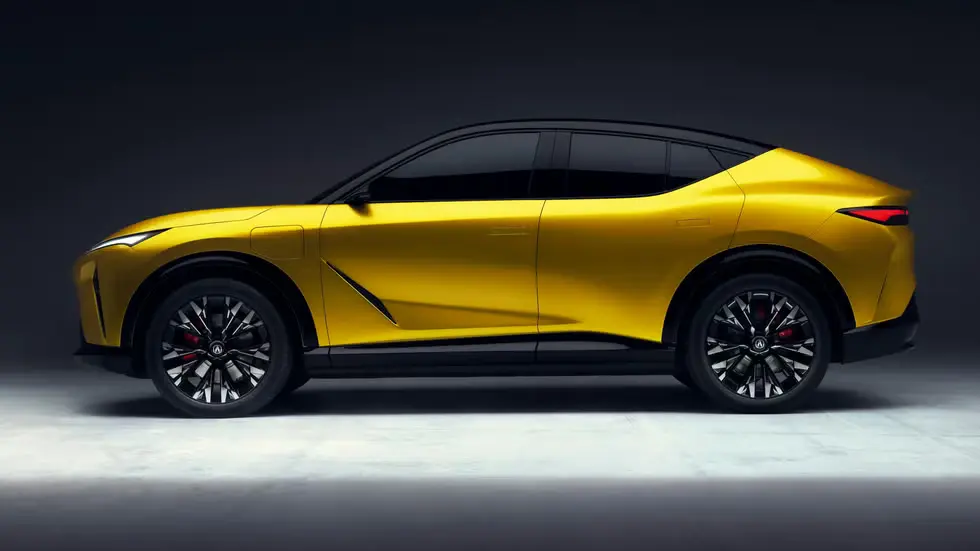 This RSX Prototype is a preview of a car coming in late 2026. It has sharp lines, a sporty roof, and big 21-inch wheels with red Brembo brakes. The bright “Propulsion Yellow Pearl” color makes it stand out. The body is two-tone, making it look lower and more dynamic.